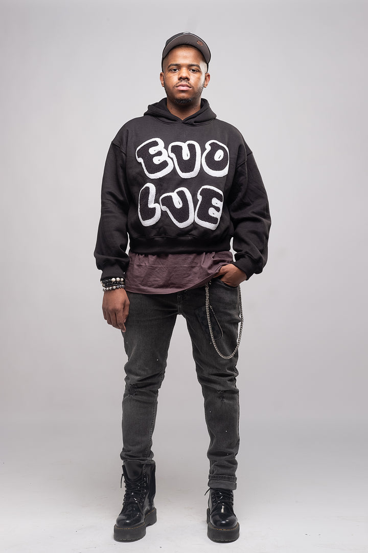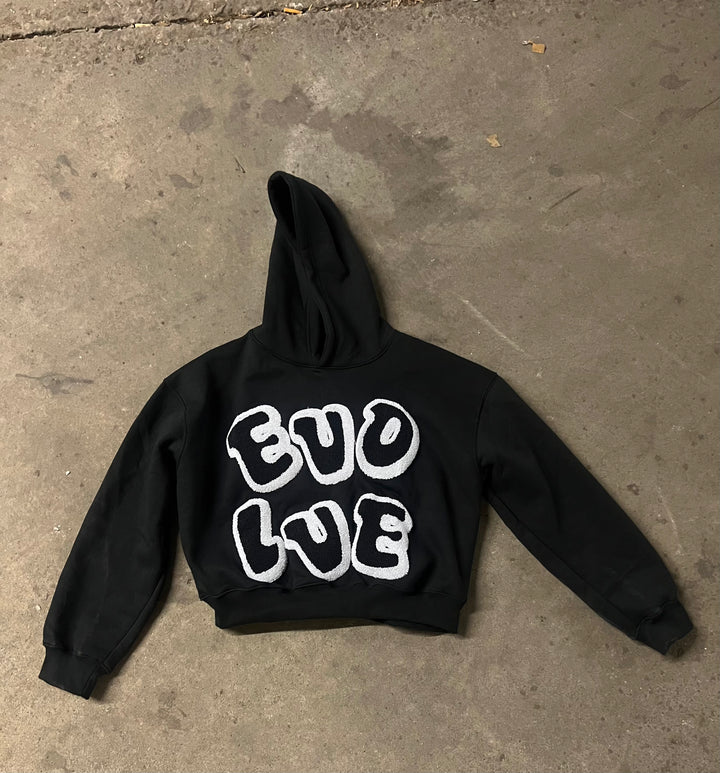 Cotton drop shoulder hoodie with embroidered patches and short torso bottom. True to size.
